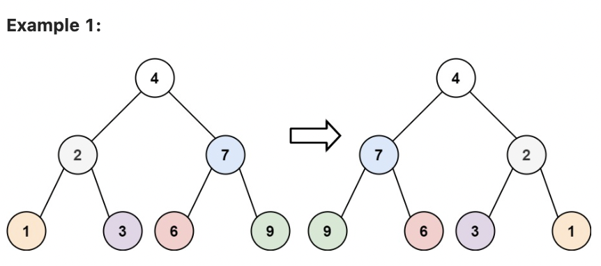 - 예시) input이 [4,2,7,1,3,6,9] 이면 output이 [4,7,2,9,6,3,1]로 각 노드의 왼쪽과 오른쪽을 바꾼 root를 반환