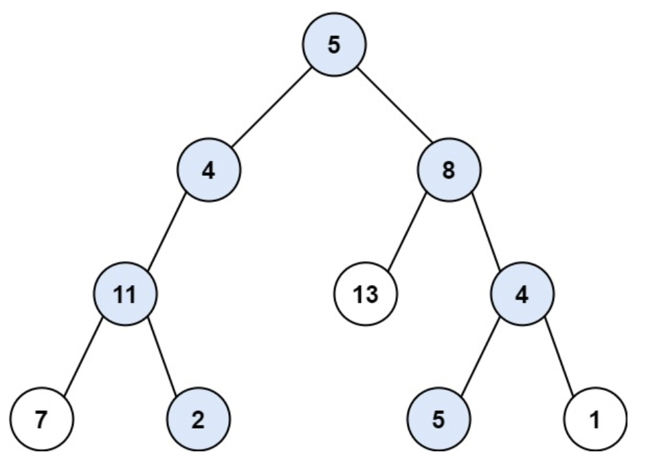 - Input: root = [5,4,8,11,null,13,4,7,2,null,null,5,1], targetSum = 22